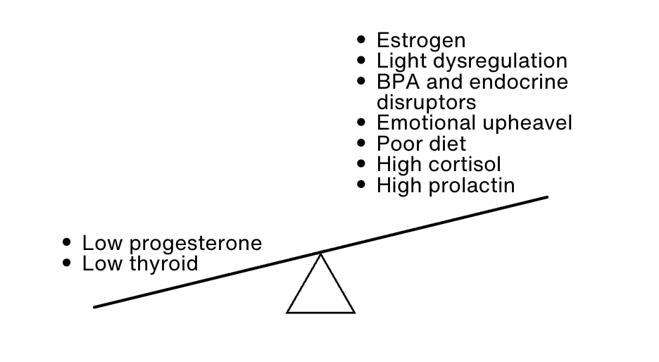 Because women with PCOS don’t regularly ovulate, they aren’t naturally producing sufficient progesterone—the natural brake on estrogen. Without ovulation, the corpus luteum does not form properly, and progesterone never rises in the second half of the cycle. This leaves estrogen relatively unopposed and allows its effects on the ovaries, thyroid, and metabolism to accumulate.