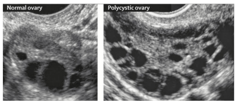 PCOS is a condition characterized by irregular or absent ovulation, elevated androgens, and the appearance of multiple small follicles on the ovaries—often described as a “string of pearls” on ultrasound.